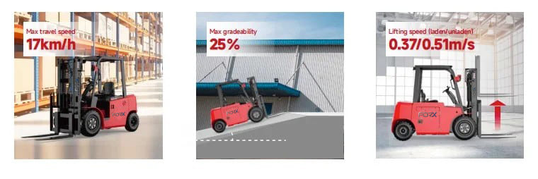 รถรุ่นนี้ช่วยเพิ่มประสิทธิภาพการทำงานด้วยสมรรถนะที่อัปเกรดใหม่ ความเร็วในการขับเคลื่อนสูงสุด 17 กม./ชม. ความเร็วในการยกสูงสุด 0.51 เมตร/วินาที และความสามารถในการไต่ทางลาดชันสูงสุด 25% ช่วยให้ทำงานบนทางลาดได้อย่างมั่นใจ
