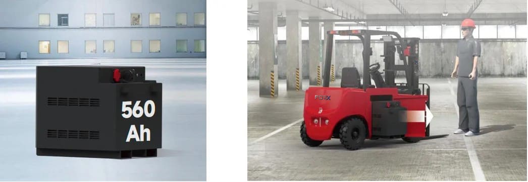 ขับเคลื่อนด้วยแบตเตอรี่ลิเธียมความจุสูง 80V/560Ah ให้พลังงานสม่ำเสมอสำหรับการยกโหลดหนัก จุดเด่นสำคัญคือระบบสลับแบตเตอรี่ด้านข้าง (Lateral-swap battery system) ที่ช่วยให้เปลี่ยนแบตเตอรี่ได้อย่างรวดเร็วและง่ายดาย รองรับการทำงานหลายกะต่อเนื่องตลอด 24/7 โดยไม่สะดุด นอกจากนี้ ยังมีเครื่องชาร์จในตัว (Integrated charger) แบบมาตรฐาน รองรับการชาร์จแบบ Opportunity Charging ได้ทุกเมื่อ เพิ่มความยืดหยุ่นในการใช้งาน