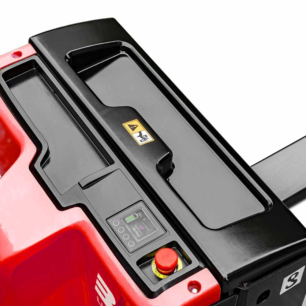 ด้ามควบคุมที่พัฒนาขึ้นใหม่มีขนาดกะทัดรัดและทันสมัย พร้อมฟังก์ชันความเร็วเต่า (Turtle Speed) ที่แสดงผลบนหน้าจอ ช่วยให้รถเคลื่อนที่ได้อย่างช้าและแม่นยำ เหมาะสำหรับการจัดเรียงหรือยกซ้อนสินค้าในพื้นที่แคบ